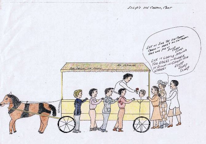 ![]() Sclip's ice-cream cart -- all flavours. The blond boy in the plaid jacket is Stan: one of the friends. He appears in many of the drawings, with the initials S. D. B on his gladstone bag. Len, Syd and Bobby line up with Les, Dot, Ern and Ron. Ron was described by all who knew him as a marvellous singer. Here he launches into the ice-cream song. "Let us sing the ice-cream chorus. Here's an ice-cream each one for us. Slurp, slurp, slurp. Lick it gently around the edges. Gobble it down in great big wedges. Slurp, slurp, slurp." |