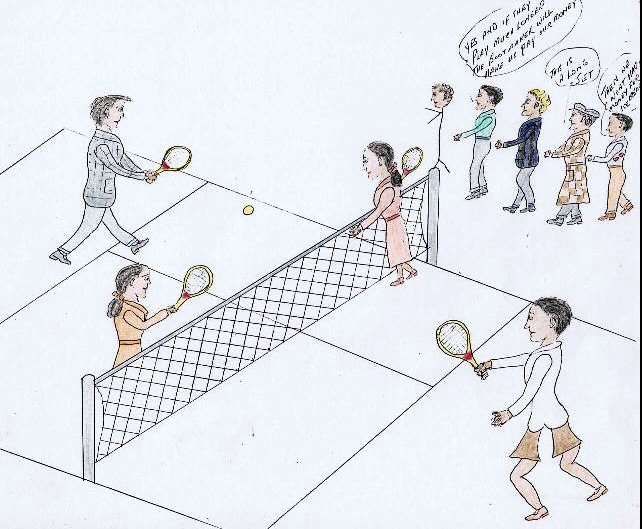 ![]() Sorry but the humour here escapes me: something about the length of the tennis match causing problems with the bootmaker. Syd, Ron, Els and Dot play doubles. They are watched by Les and Len ("Yes and if they play much longer the bootmaker will make us pay our money.") Stan is there with Ern ("This is a long set") and Bobby worries that there will be no money left for ice-creams. |