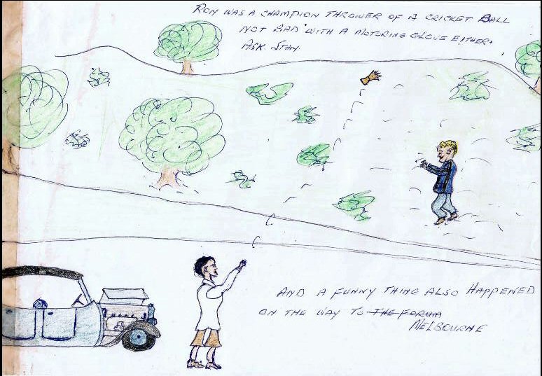 ![]() And a funny thing also happened on the way to Melbourne ("the Forum" is crossed out). Ron was a champion thrower of a cricket ball. Not bad with a motoring glove either. Ask Stan. |
