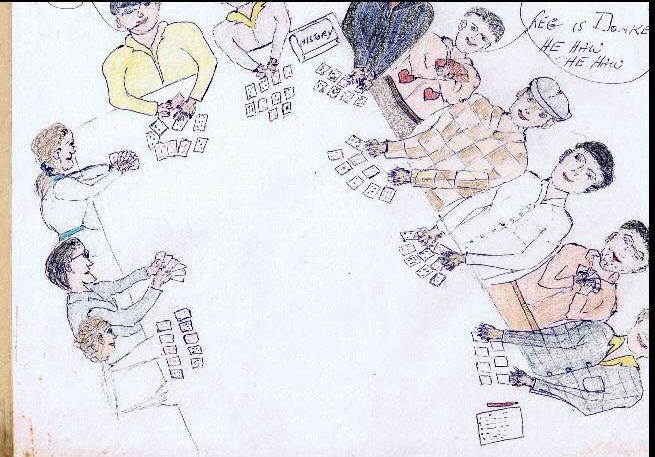 ![]() Card games were ever popular. Here, Bobby jokes: "Reg is donkey. Hee haw, hee haw!" |