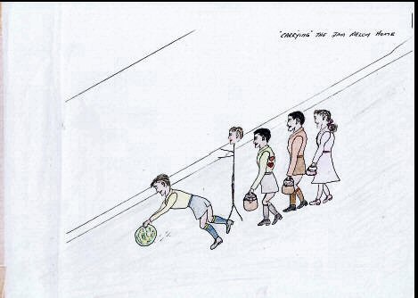 ![]() "Carrying" the jam melon home. Syd is in charge of transporting the melon, while Les cheers him on. Bobby and Len have laden baskets to carry, whereas Els is in charge of the moolah (ie money). |