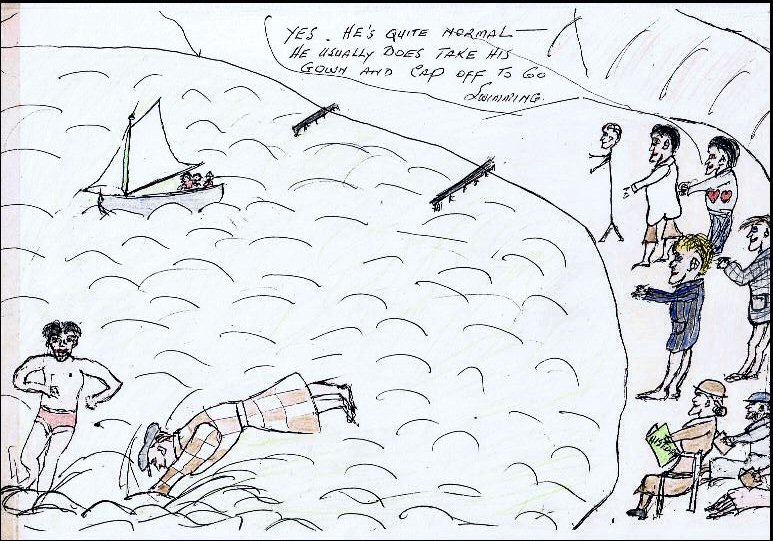 ![]() Because of Les's cartoon regime, we are uncertain if Ern is dressed as he is for purposes of identification ... Or did he REALLY dive into the water in cap and gown? I go for the former. As Bobby says: "Yes. He's quite normal. He usually DOES take his gown and cap off to go swimming." |